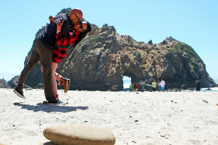 The Canon 1D was on a large stone. This is in Big Sur. I wanted both my wife and I and the rock formation behind us to be large on the photo, so I placed the camera far from the rock so that I would get the whole thing in the image. I lined up the rock and then had my wife stand close to the camera so that we would also fill up the frame. After focusing on her, I got in the photo.My Canon 1D was placed on a concrete rail and I pointed it upward. Both us and the statue fill up the frame. I used a remote shutter button.This selfie was taken with an iPhone 7. I followed some simple photography rules. It was a very sunny day with harsh shadows, so we took the photo in the shade. I held the camera low for a different perspective. I made sure we filled the frame. And this photo tells the story of us being at a high-class affair.