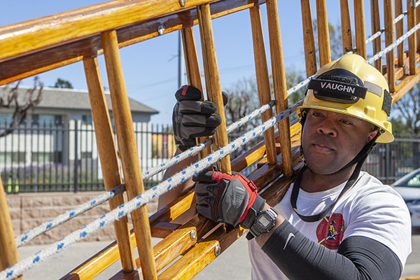 When Vaughn started to look into a career with the fire department, he was looking for stability in his life, as his son was born in 2019. He applied to the fire department in February of 2020, which was when he joined the Stentorians of Los Angeles City, a non-profit community-based organization for African American firefighters. The organization shares a building on the corner of Vernon Avenue and Normandie Avenue with the Los Angeles County Stentorians. With the Stentorians, Vaughn received firefighting training as well as guidance through the hiring process.