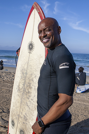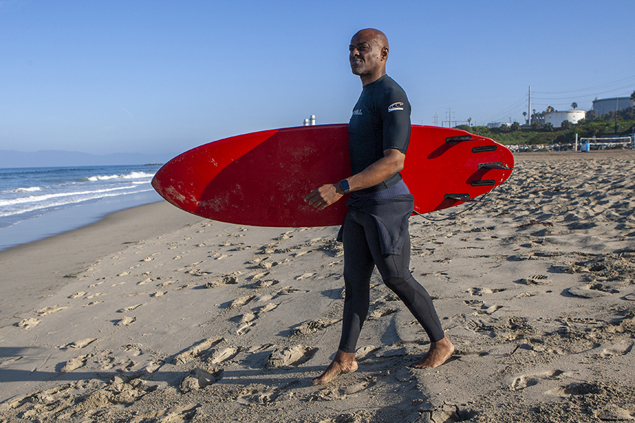 El Porto Beach is at the northern portion of Manhattan Beach, and without traffic, Cooper can get there quickly from his home in Inglewood. He also surfs at beaches up and down the Southern California coastline.