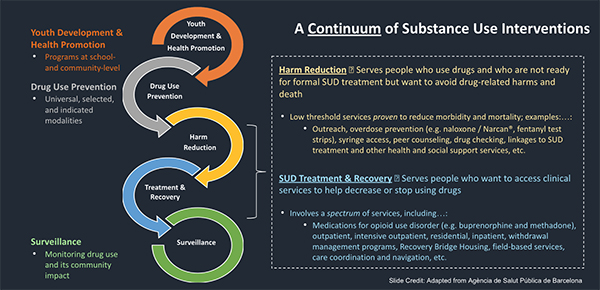 “The strategy to address overdose actually starts with youth development and health promotion,” Hurley said.  “Our county is deeply invested in positive youth development and health promotion. We also as a health department invest in substance use prevention.  But the bulk of our resources actually are in harm reduction and treatment and recovery.  Harm reduction and treatment and recovery are categories of services that work with people who are directly impacted by substance use.  Harm reduction services include things like naloxone distribution.  It includes things like test strip distribution.  It includes things like working with people who use substances without the expectation that they're ready to entirely stop using, without the expectation that people who use drugs are ready to stop at the moment you talk to them.  We also deeply invest in substance use treatment and recovery services, services that are focused around change oriented treatments to help people change their relationships with substance use.  And there's a popular misconception that the more harm reduction services you do somehow take away from treatment or the more treatment you do somehow takes away from harm reduction.  That is just not true.  Providing harm reduction services saves lives, reduces overdose rates, reduces the spread of infectious disease, and increases the chance that people go to treatment.  Working with people who may not be committed to abstinence is deeply important on the treatment side.  So both of these arms, we need to do more of both if we're really going to engage our community and try to eliminate health disparities and reach all the people impacted by substance use that we need to reach in order to make an impact.”
