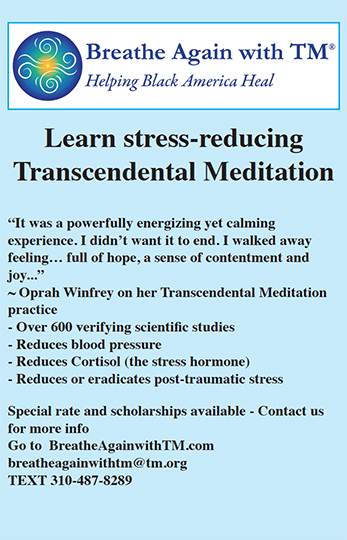“Black Americans are a very unique ethnic group,” said Rashied Jibri, executive committee member of Breathe Again with TM. “We’re about the only ethnic group that has been disconnected from our heritage. In psychology, the feeling of belonging is very important. If someone feels isolated, that is very traumatic. Subconsciously, since slavery, we’ve been cut off and it’s a deeply-rooted trauma that’s been going on from generation to generation. This is what gives rise to high blood pressure, diabetes, and other issues that run rampant among African Americans. Transcendental meditation has been shown to reduce those deeply rooted generational stresses caused by trauma.”