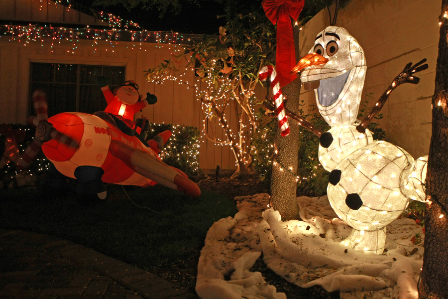 One of his daughter’s loved Santa Claus when she was a small child, so Ronald has St. Nick in an inflated propeller airplane. His other daughter loved the animated movie “Frozen,” so the character Olaf from the film is featured. Ronald created one section that’s called “Fantasyland,” which features Mickey and Minnie Mouse, and a scene from the 1964 Christmas stop-motion animated television special Rudolph the Red-Nosed Reindeer.