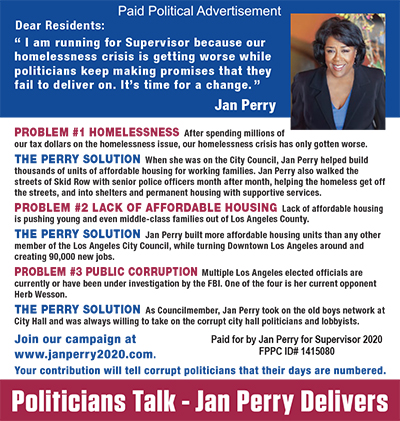 Jan C. Perry has received endorsements from The United Homeowners Association II (View Park-Windsor Hills), MLK Democratic Club, and the Gardena Valley Democratic Club.