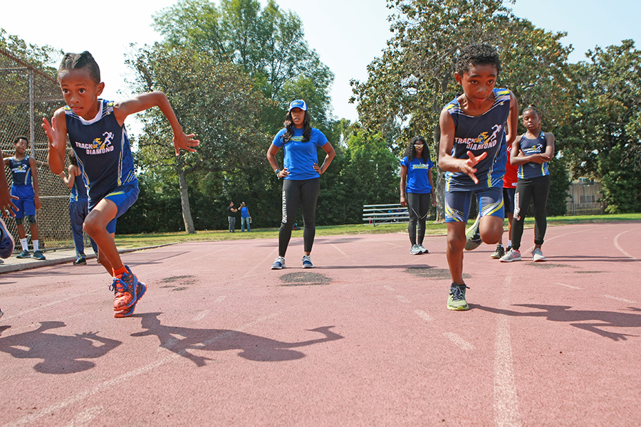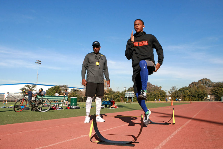 Speed coach Christopher Mack trains many of his young athletes at Jackie Robinson Stadium in Rancho Cienega Sports Complete. Photo by Jason Lewis